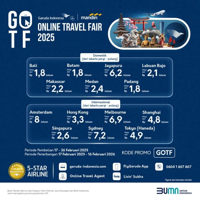 Pada pelaksanaan GOTF 2025, Garuda Indonesia kembali bekerjasama dengan Bank Mandiri sebagai bank partner. Promo Mandiri Kartu Kredit – ekstra diskon hingga Rp3.500.000, cicilan 0% hingga 12 bulan dan flash sale.