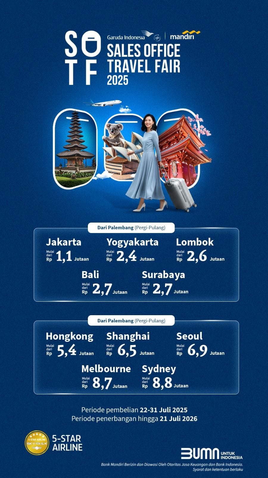 Intinews | Maskapai penerbangan nasional Garuda Indonesia berkolaborasi dengan Bank Mandiri sebagai bank partner, kembali menggelar Sales Office Travel Fair (SOTF), mulai tanggal 22-31 Juli 2025 di Kantor Garuda Indonesia, Jl A.Rivai Palembang.