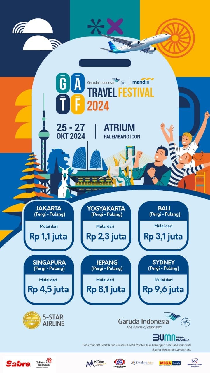 Intinews | Maskapai penerbangan nasional Garuda Indonesia bersama dengan Bank Mandiri segera menghadirkan program travel fair tahunan bertajuk Garuda Indonesia Travel Festival (GATF) 2024 yang dilaksanakan di 7 (tujuh) kota besar di Indonesia dan 3 negara mulai tanggal 25 Oktober 2024 secara bertahap sampai dengan 1 Desember 2024 mendatang.