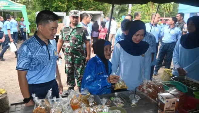 Komandan Lanud SMH, Zulfikri Arif Purba mengunjungi salah satu stand bazar umkm