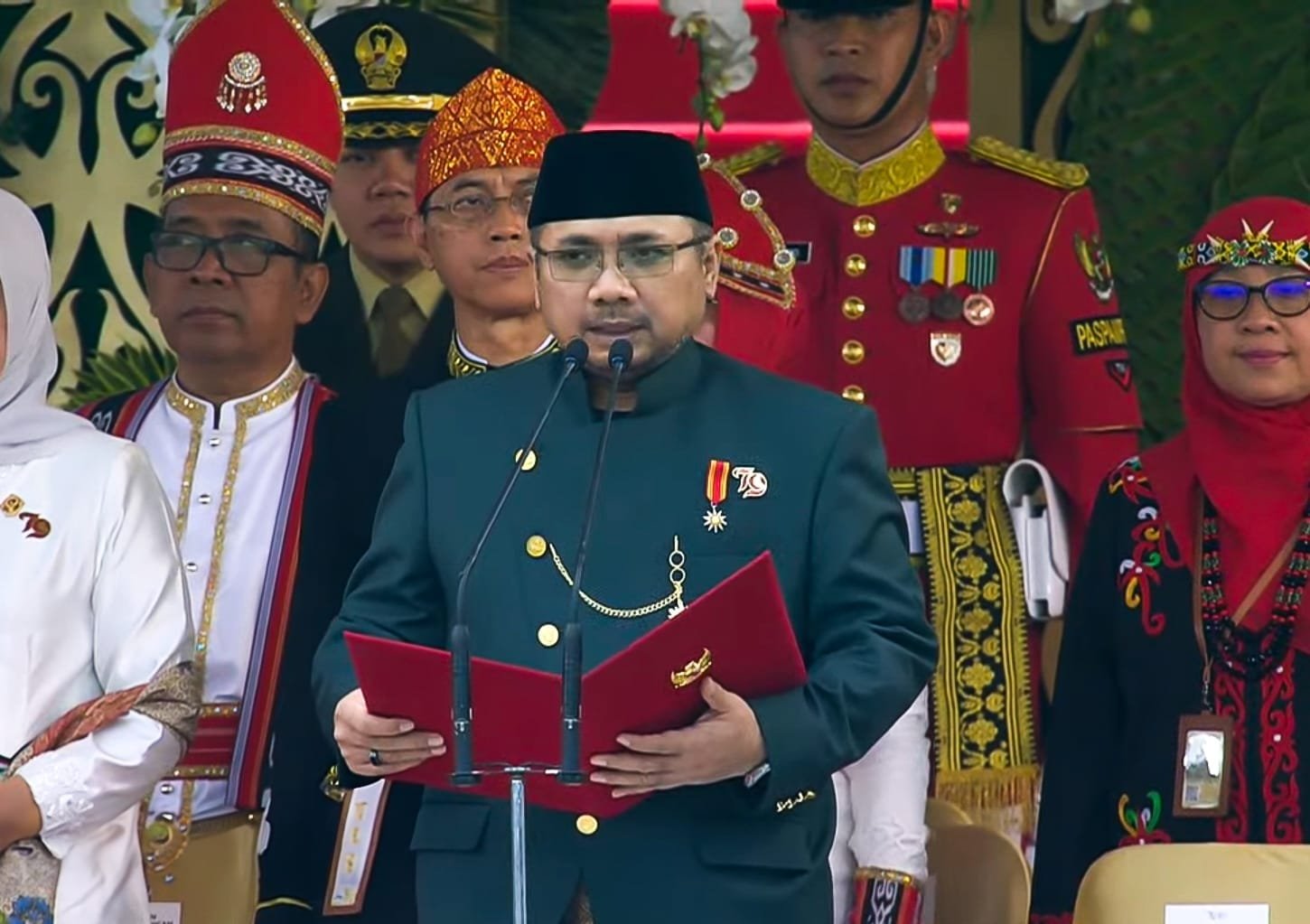 Intinews | Menteri Agama (Menag) Yaqut Cholil Qoumas didaulat membacakan doa dalam Upacara Peringatan HUT ke-79 Republik Indonesia, yang digelar perdana di Ibu Kota Nusantara (IKN).